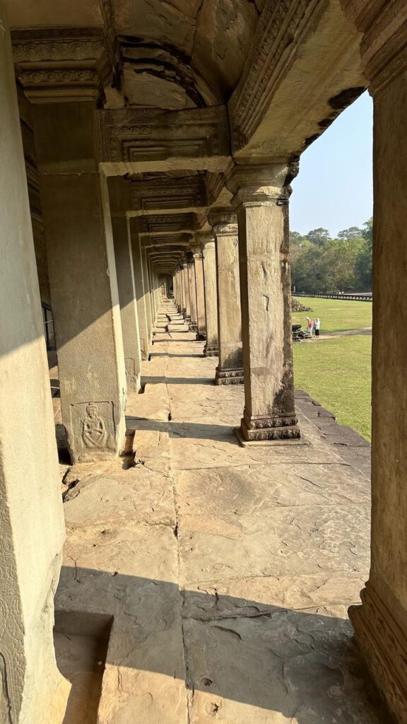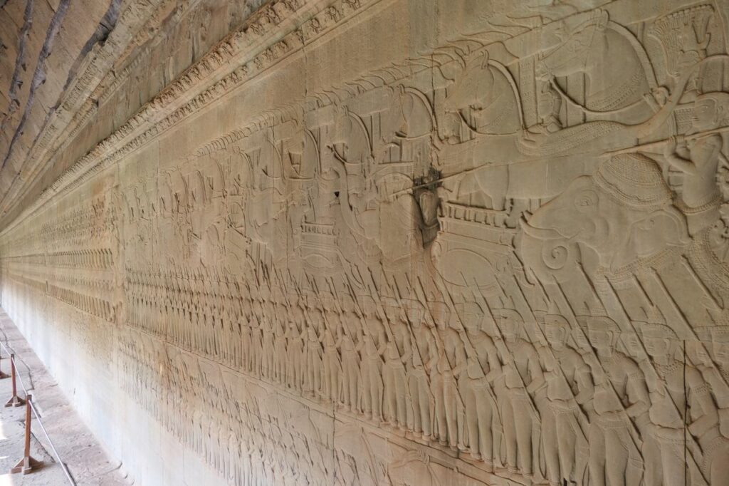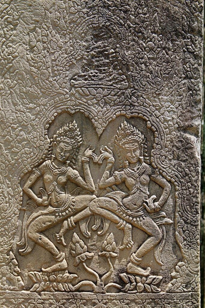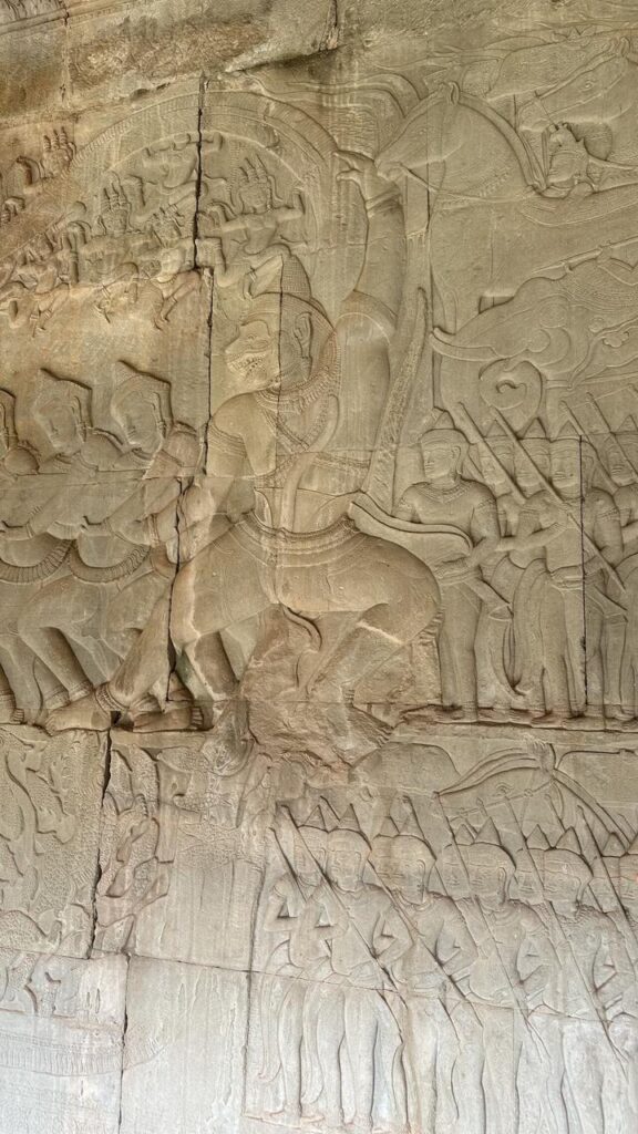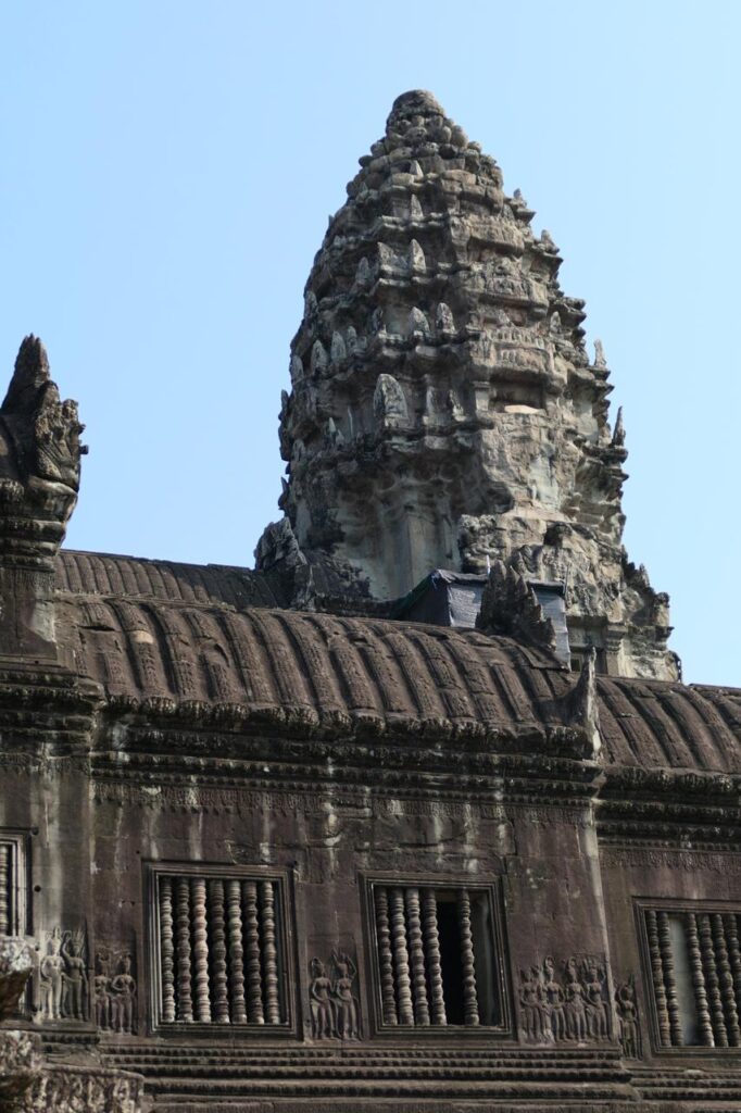 Wir kamen von einem Seiteneingang und es war ein erhebendes Gefühl endlich hier zu sein. Die Reliefs in den Galerien sind unglaublich. Sie erzählen hinduistische Mythen und Legenden. Über jeder Tür ein unbeschreiblich verzierter Türsturz. Der Hauptturm ist 65m hoch und kein Gebäude in Siem Reap darf höher gebaut werden. Die Tempel sind teilweise aus Lava-Basalt (Fundamente) und teilweise aus Sandstein (verzierte Gebäude) gebaut. Zumindest die Türsturz-Reliefs wurden meist in nachträglich aufgetragenen Putz eingeritzt. Vieles wurde aber auch direkt aus dem Stein geschnitzt, nachdem er verbaut war. Der Wassergraben ist der kosmische Ozean, der von der Regenbogenbrücke überspannt wird, der Tempel selbst stellt den Götter-Berg Meru dar. Die Türme repräsentieren Lotus-Blüten. Damit folgt der Tempel dem allgegenwärtigen Schema von Himmel und Hölle.