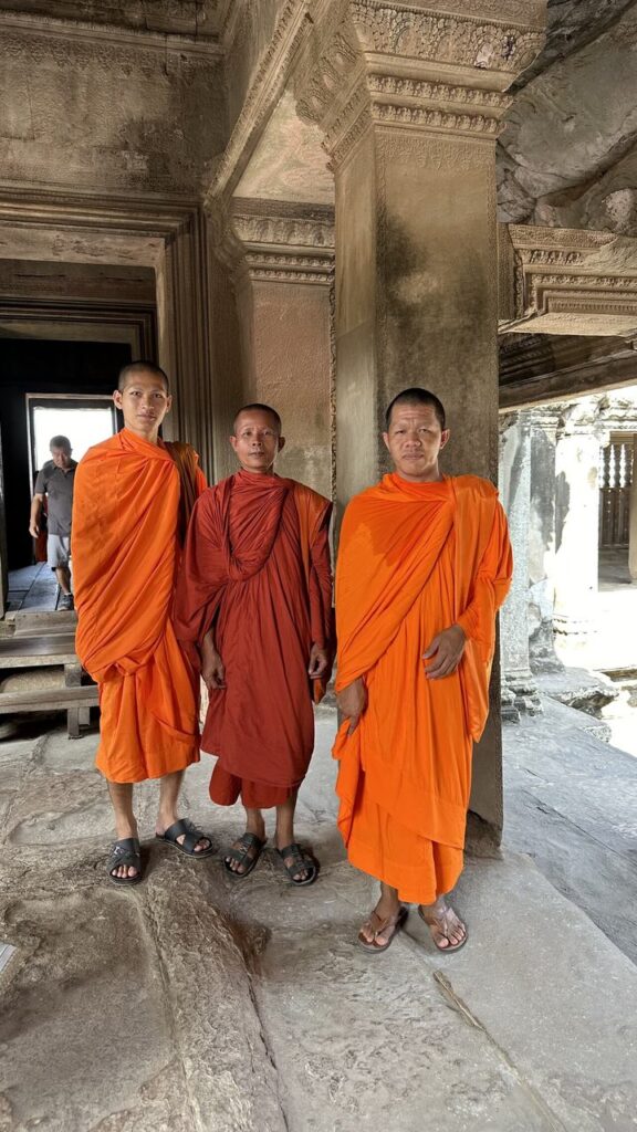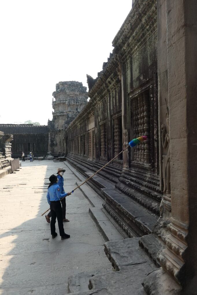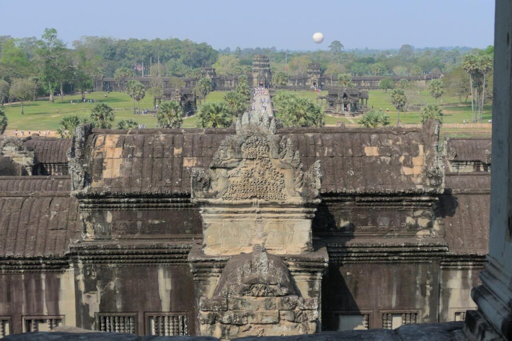 Gemeinsam mit Larissa und einem Guide (der tatsächlich 6 oder 7 Sprachen fließend spricht…) ging es los mit dem Haupttempel. Angkor heißt „Hauptstadt“ auf Sanskrit (die Erbauer waren zunächst Hinduisten), Wat heißt Tempel oder Kloster. Das Gelände umfasst über 200 ha und zahllose Tempel. Man kann hier locker zwei Wochen verbringen.