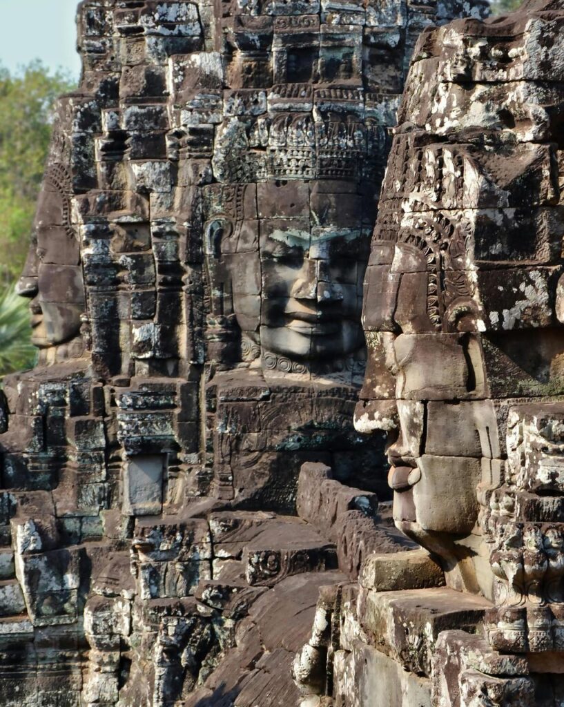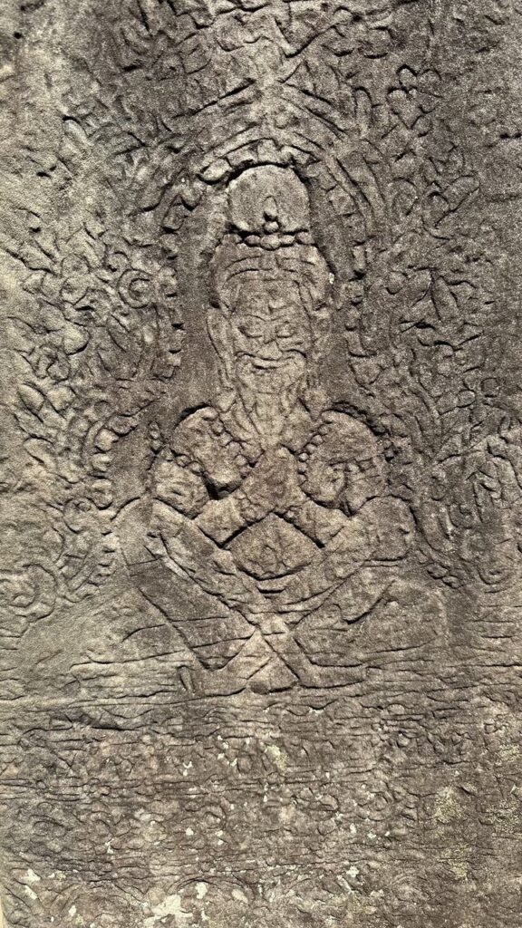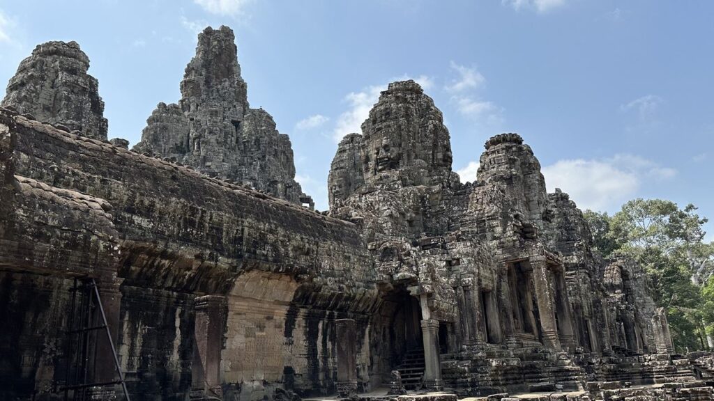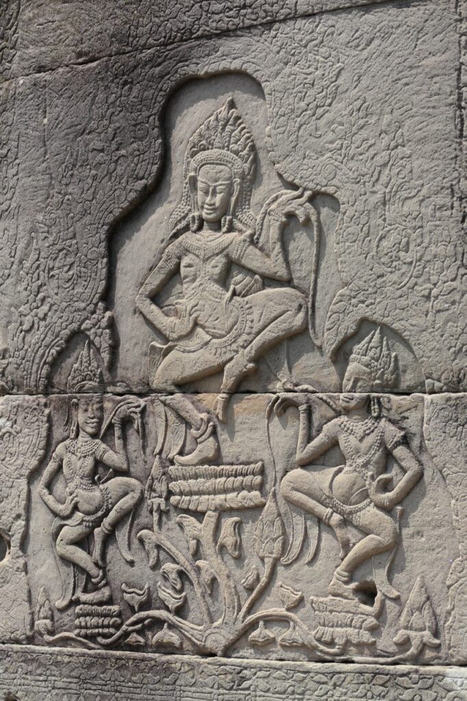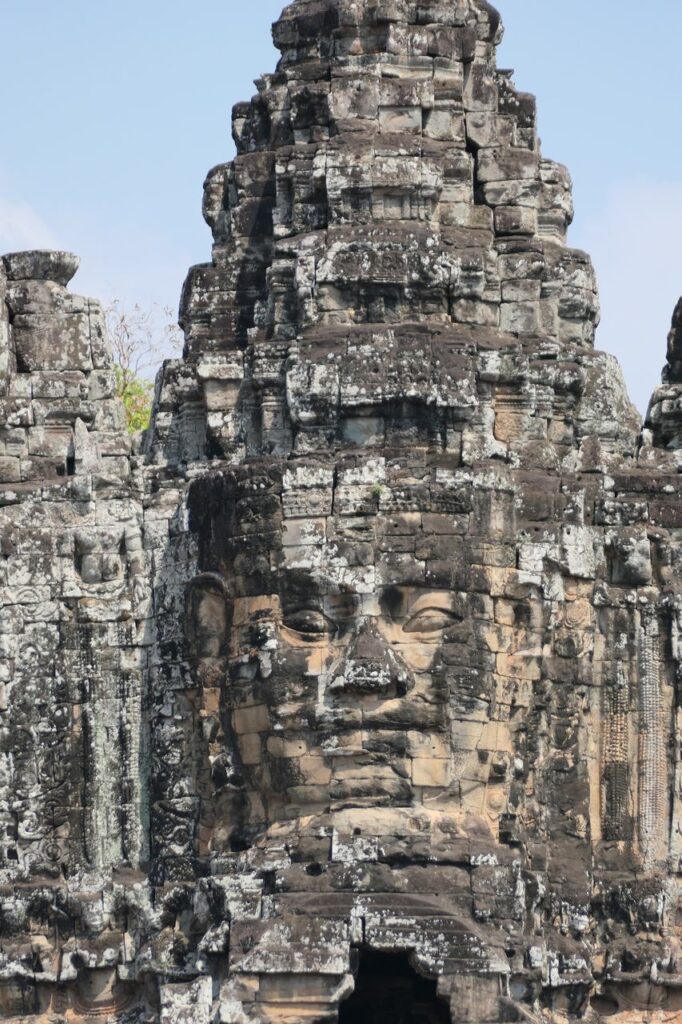 Der zweite Tempel, den wir besichtigt haben, war Bayon. In der Bayon Ära wechselte die Staatsreligion von Hinduismus zu Buddhismus. Später, als die Religion erneut wechselte, versuchte man die eingeritzten Buddhas im Lotussitz durch Brahmin zu ersetzen. Man kann häufig noch beide Figuren ein wenig erkennen. Der Bayon Tempel ist der größte und älteste seiner Ära. Er gehört zur ehemaligen Hauptstadt Angkor Thom und hat 53 Türme, um die damaligen 53 Provinzen zu repräsentieren, sowie einen zentralen Turm für Angkor Thom selbst. Die Reliefs zeigen Geschichten über Kriege und das Alltagsleben. Die Gesichter repräsentieren die vier guten Charakteristiken des Buddhismus und des Königs. Aktuell laufen Restaurierungen, daher kann man leider nicht auf die oberen Etagen, ich habe aber ein paar frei verfügbare Bilder gefunden.