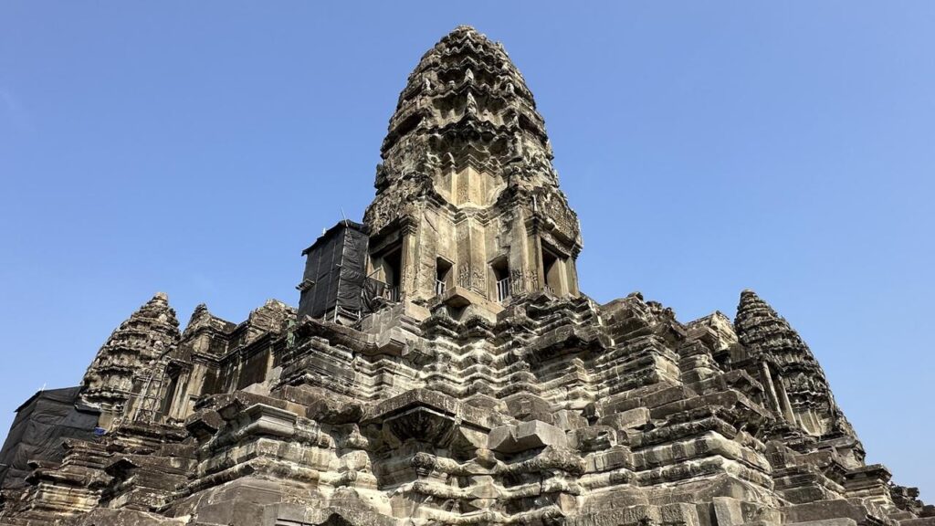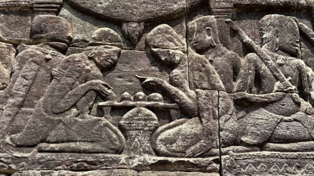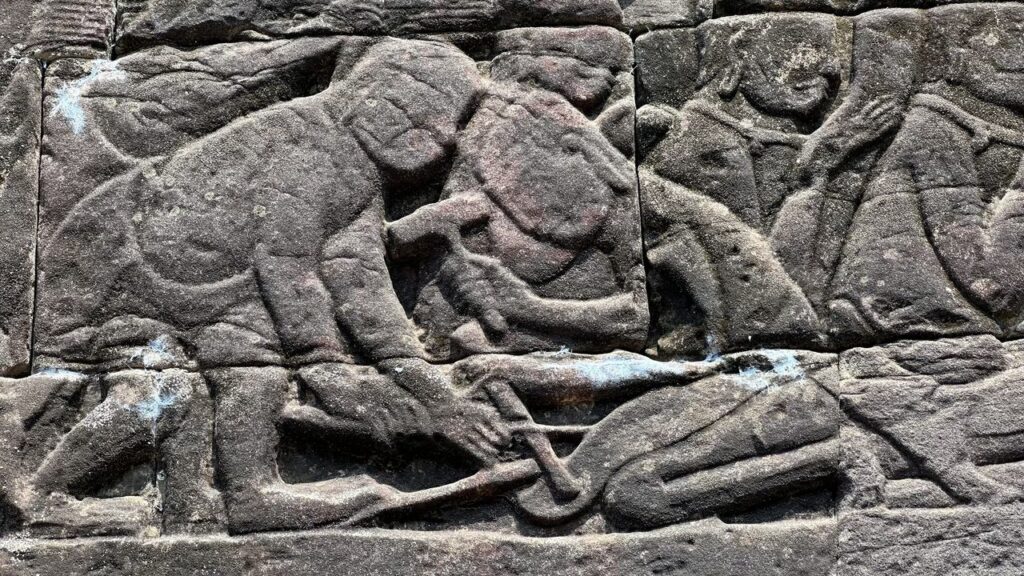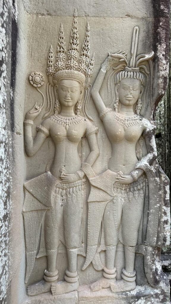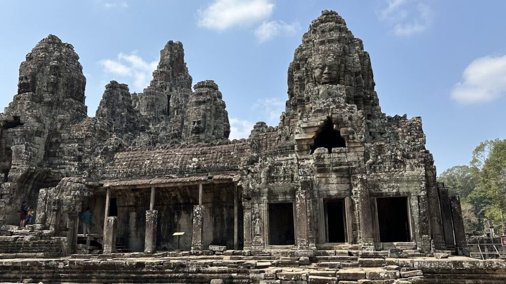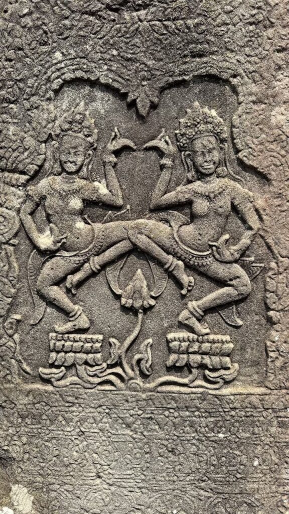 Der zweite Tempel, den wir besichtigt haben, war Bayon. In der Bayon Ära wechselte die Staatsreligion von Hinduismus zu Buddhismus. Später, als die Religion erneut wechselte, versuchte man die eingeritzten Buddhas im Lotussitz durch Brahmin zu ersetzen. Man kann häufig noch beide Figuren ein wenig erkennen. Der Bayon Tempel ist der größte und älteste seiner Ära. Er gehört zur ehemaligen Hauptstadt Angkor Thom und hat 53 Türme, um die damaligen 53 Provinzen zu repräsentieren, sowie einen zentralen Turm für Angkor Thom selbst. Die Reliefs zeigen Geschichten über Kriege und das Alltagsleben. Die Gesichter repräsentieren die vier guten Charakteristiken des Buddhismus und des Königs. Aktuell laufen Restaurierungen, daher kann man leider nicht auf die oberen Etagen, ich habe aber ein paar frei verfügbare Bilder gefunden.