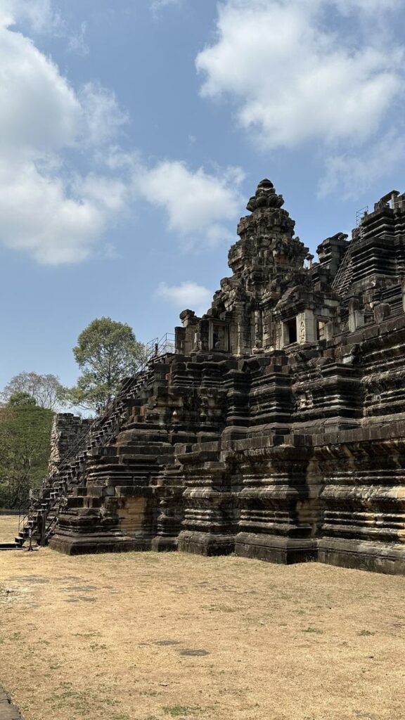 Als nächstes fuhr uns Roth mit unserem wunderbaren Kaffee-TukTuk nach Baphuon und zur Elephant Terrace. Baphuon ist Shiva gewidmet (man findet auch überall Shiva Linga, die ich das erste Mal in Vietnam in den Champa-Türmen gesehen habe). Hier gibt es viele Affen. Die Ebene vor der Elefanten-Terrasse war wahrscheinlich für Entertainment-Zwecke. In dieser Ecke gibt es auch noch die „Terrasse des Leprakönig“, den man so genannt hat, weil ihm Körperteile fehlen. Wahrscheinlich sind sie aber einfach verwittert 😉