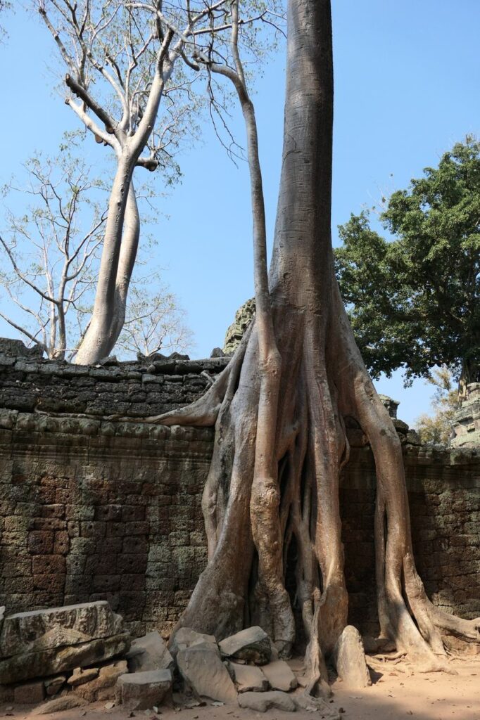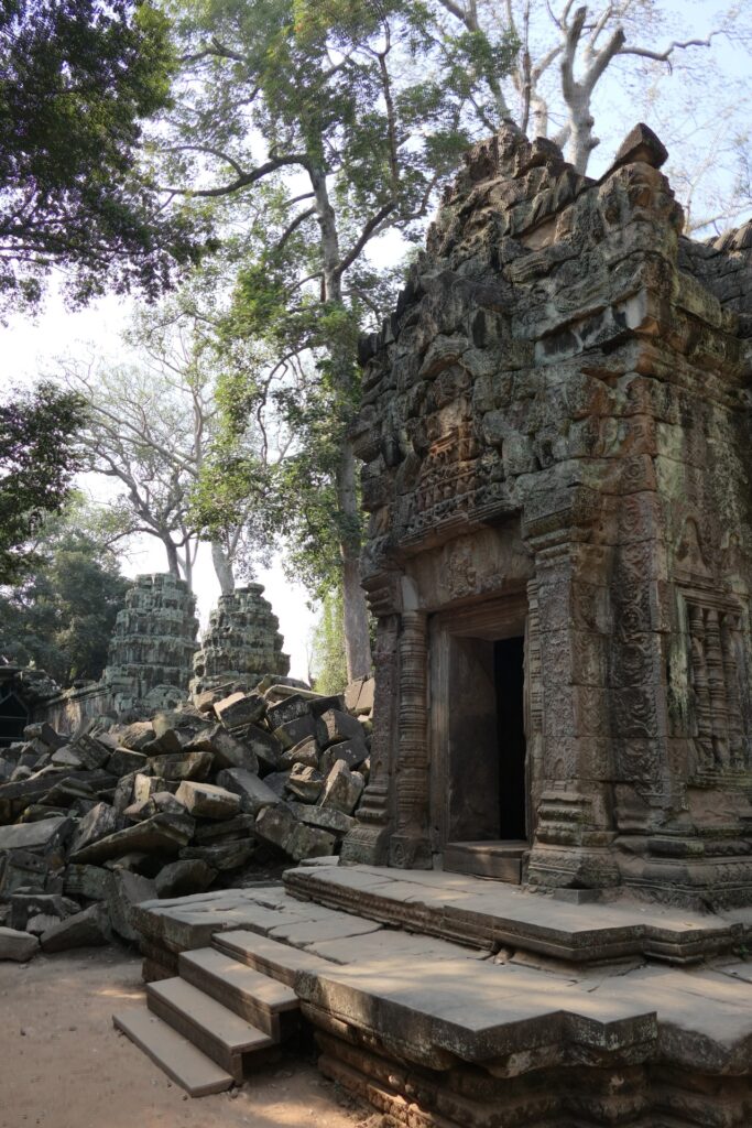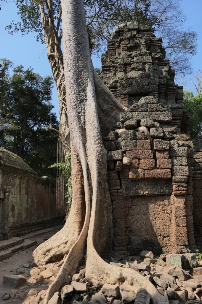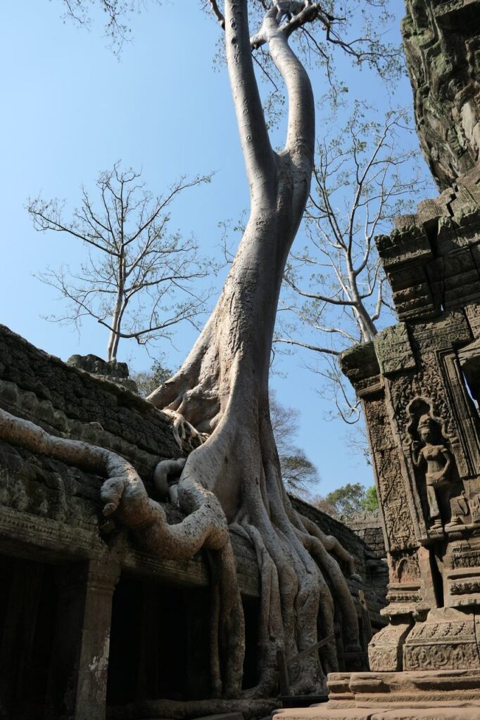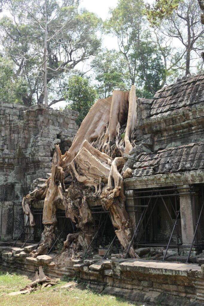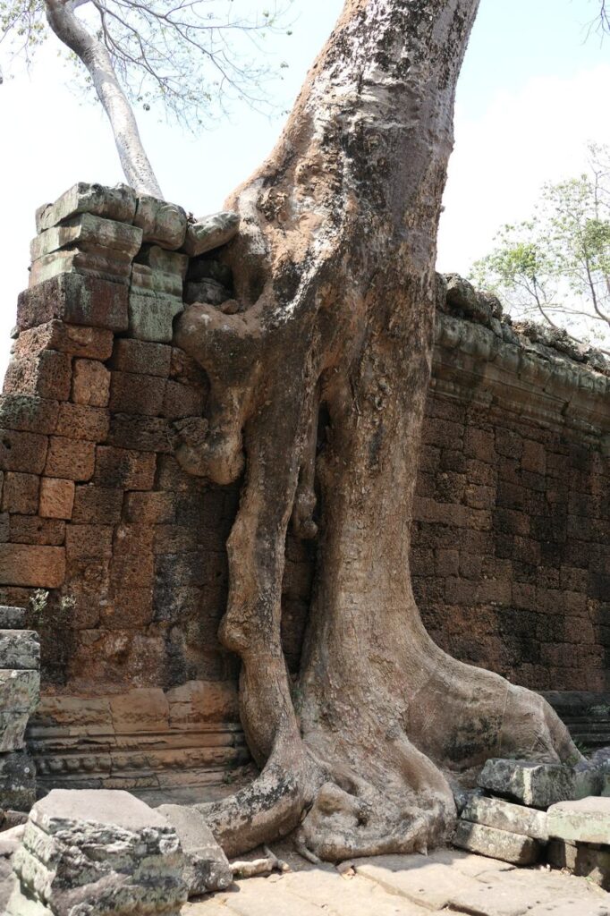 Der Tempel ist auch heute noch an vielen Stellen mit riesigen Bäumen überwuchert. Leider entscheidet man eher für die Erhaltung der Gebäude als der Bäume im Sinne ihrer geschichtlichen und kulturellen Bedeutung. Trotzdem – der Bewuchs macht diesen Ort geradezu magisch. Leider war hier am Nachmittag ziemlich viel los und es war schwer gute Fotos zu bekommen. Wir wollten eigentlich zum Sonnenaufgang hierher, aber unser Guide meinte, dass der Tempel wegen seines Bewuchses am Nachmittag am erträglichsten sei (im Gegensatz beispielsweise zu den Terrassen, die dann bei 36 Grad im Schatten voll in der Sonne liegen).
