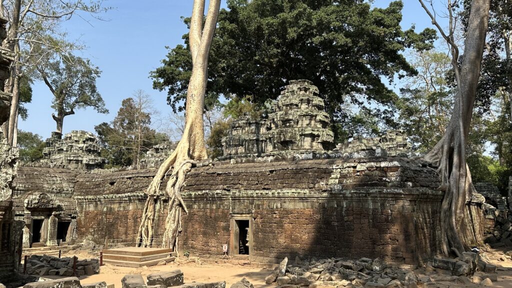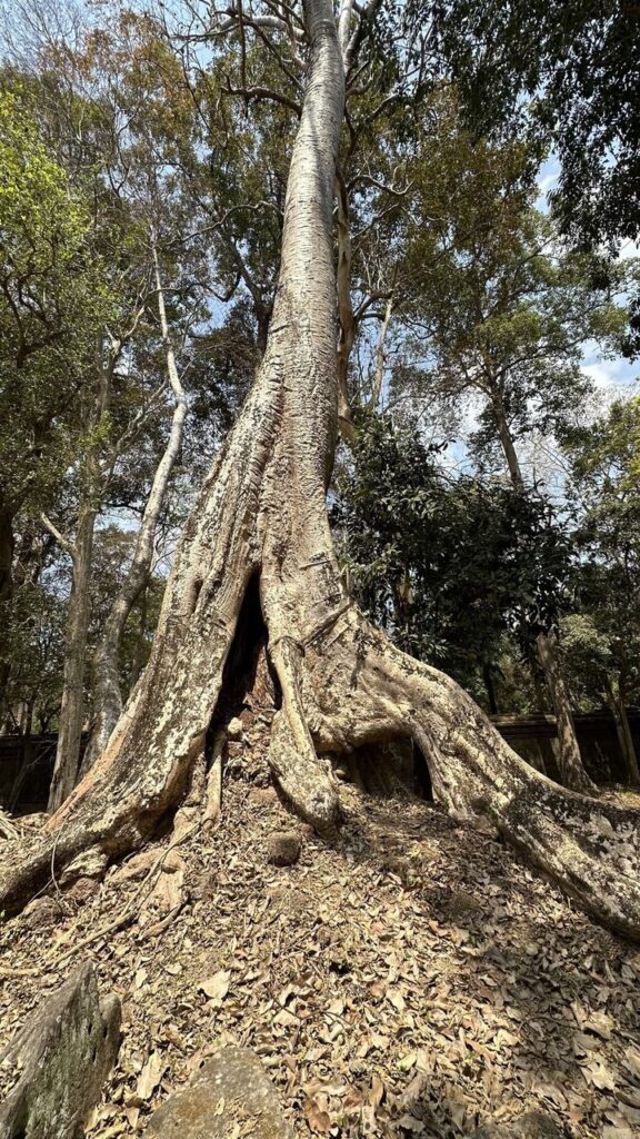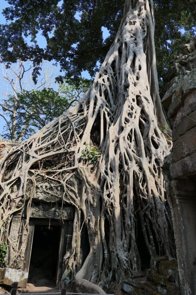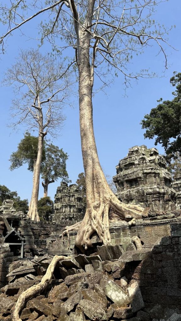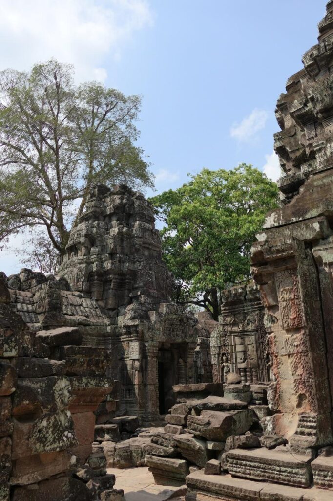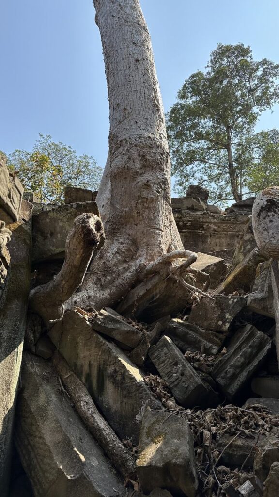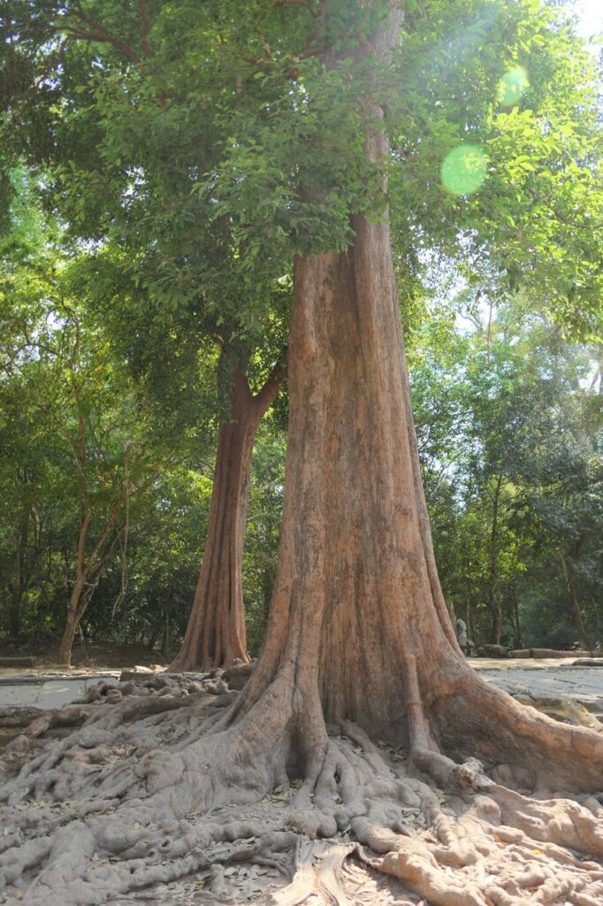 Der Tempel ist auch heute noch an vielen Stellen mit riesigen Bäumen überwuchert. Leider entscheidet man eher für die Erhaltung der Gebäude als der Bäume im Sinne ihrer geschichtlichen und kulturellen Bedeutung. Trotzdem – der Bewuchs macht diesen Ort geradezu magisch. Leider war hier am Nachmittag ziemlich viel los und es war schwer gute Fotos zu bekommen. Wir wollten eigentlich zum Sonnenaufgang hierher, aber unser Guide meinte, dass der Tempel wegen seines Bewuchses am Nachmittag am erträglichsten sei (im Gegensatz beispielsweise zu den Terrassen, die dann bei 36 Grad im Schatten voll in der Sonne liegen).
