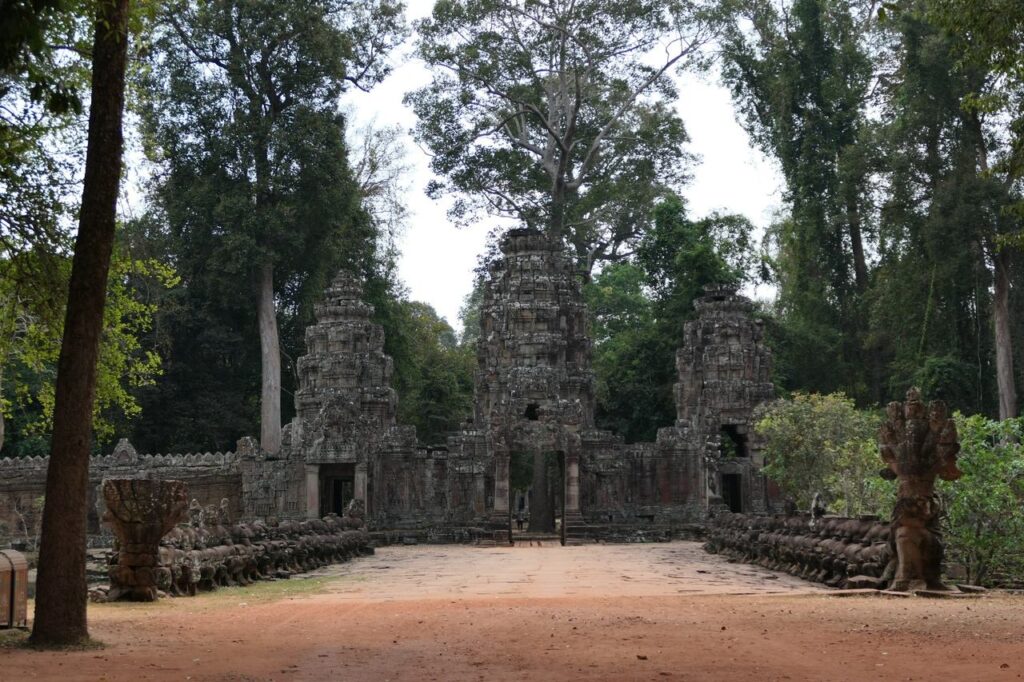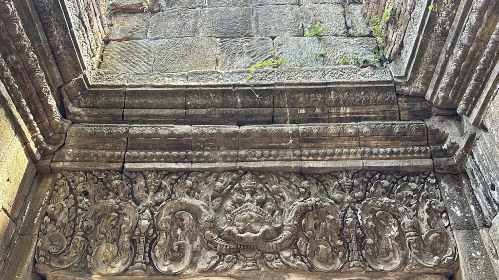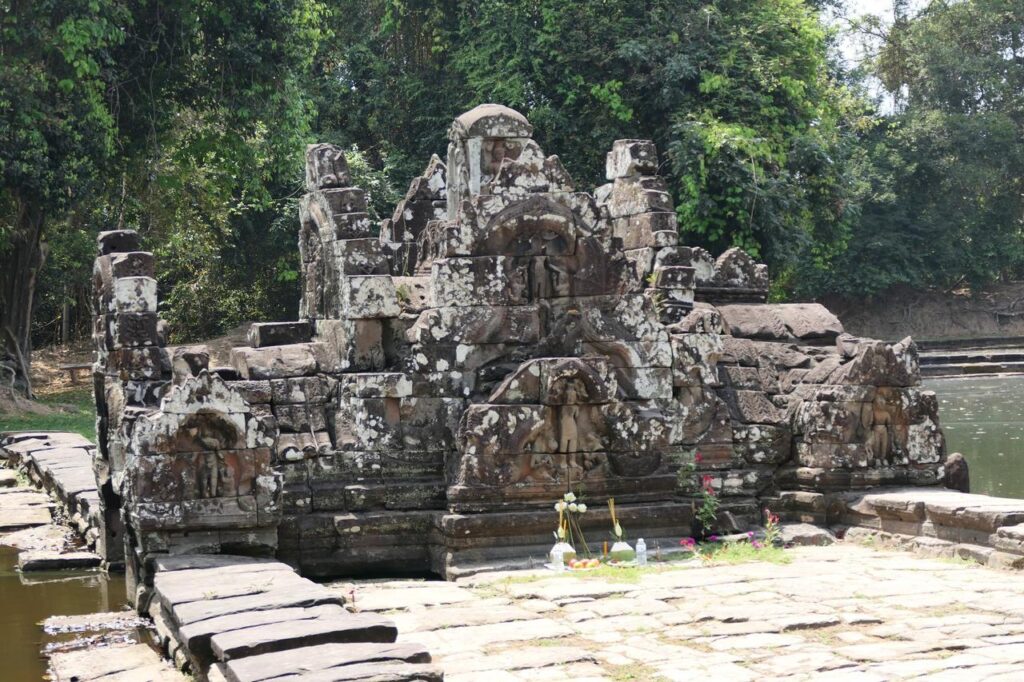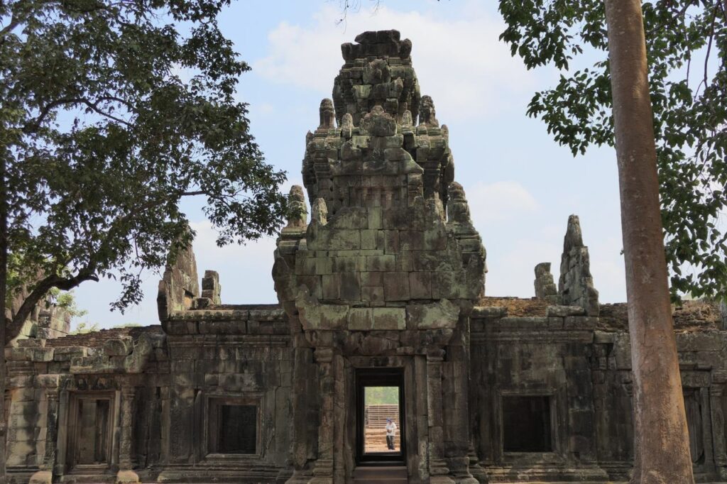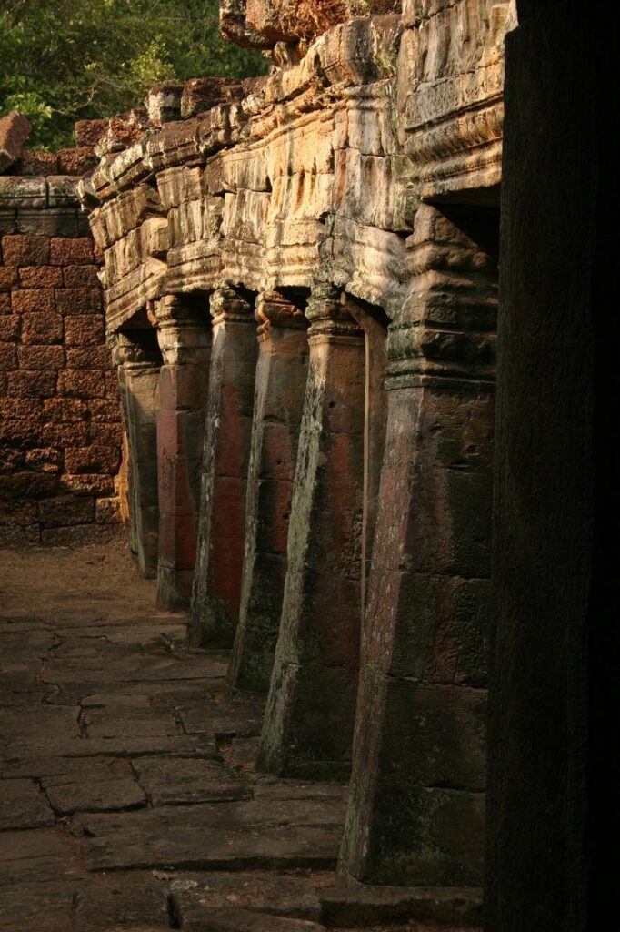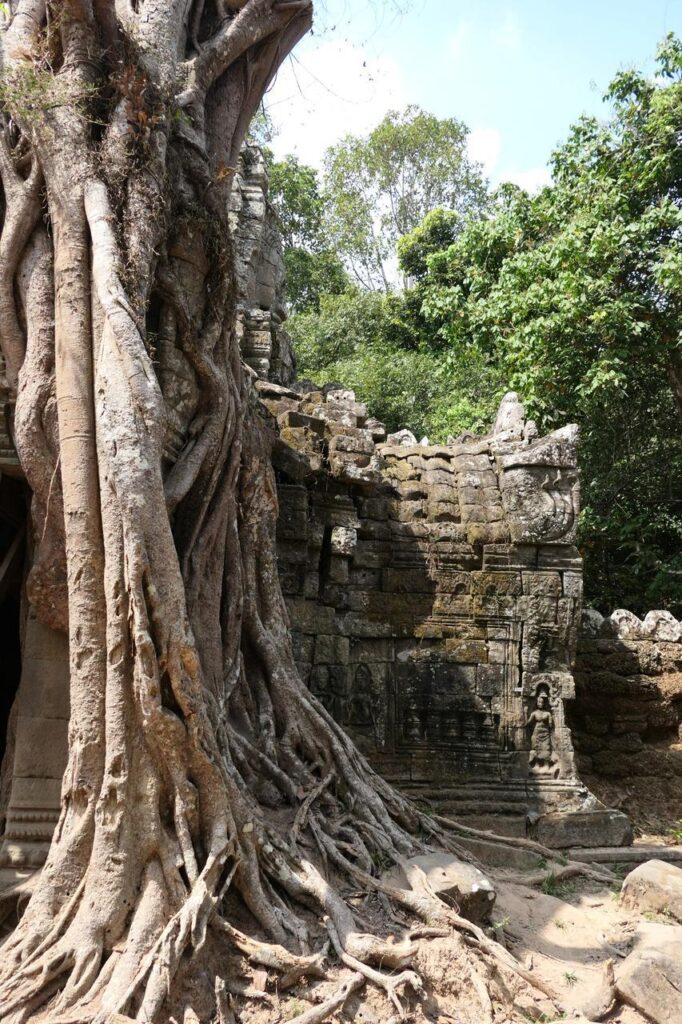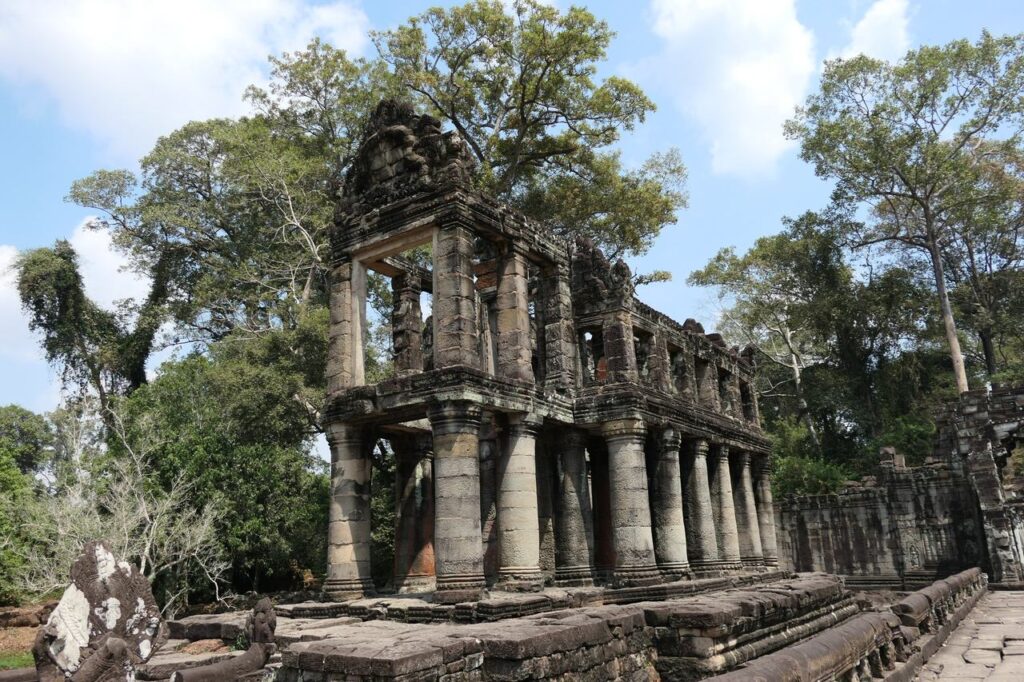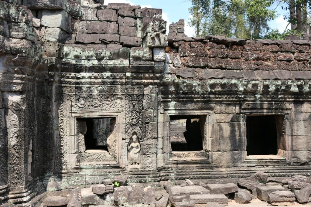 Prea Khan war vor Angkor Thom die Hauptstadt und war dem Sieg über die Cham Invasoren gewidmet. Entlang der gesamten Mauer halten Garuda, Adlerwesen, die Naga-Schlange. Man kann hier auch sehen, wie die Fenster aus dem Stein geschnitzt wurden, da einige nicht fertig geworden sind. Dummerweise hat man hier poröses Lavagestein für den Bau genutzt. Dadurch ist es feuchter und es setzt sich viel Vegetation fest. Der Tempel muss alle zwei Jahre komplett gereinigt werden.