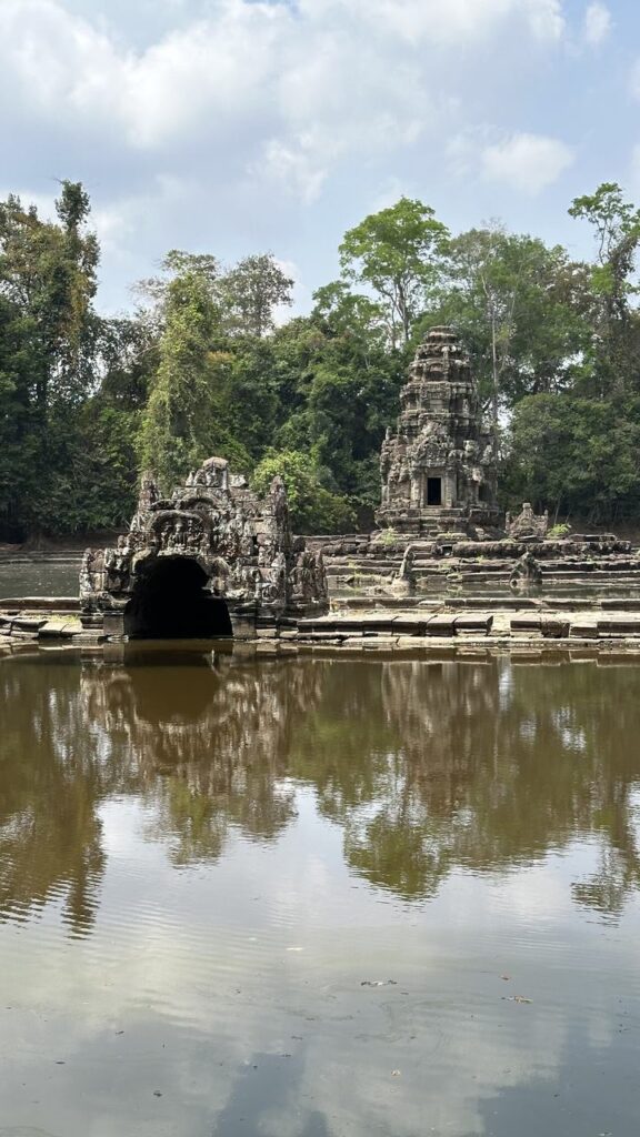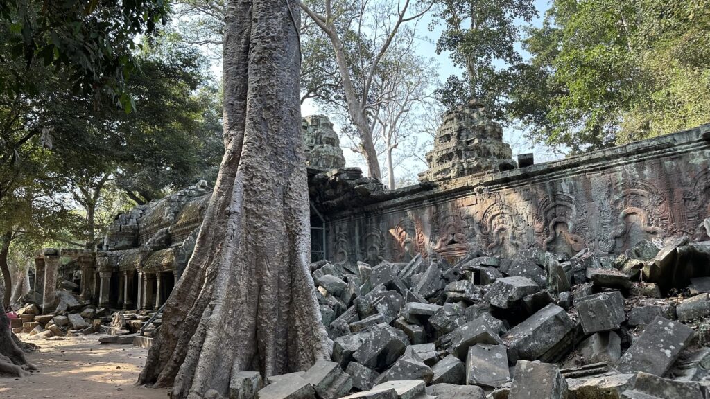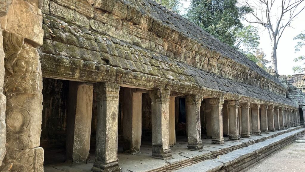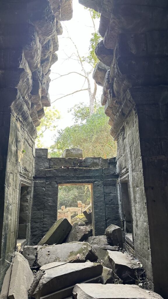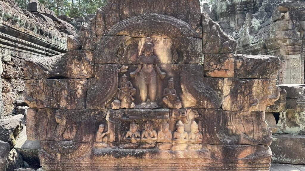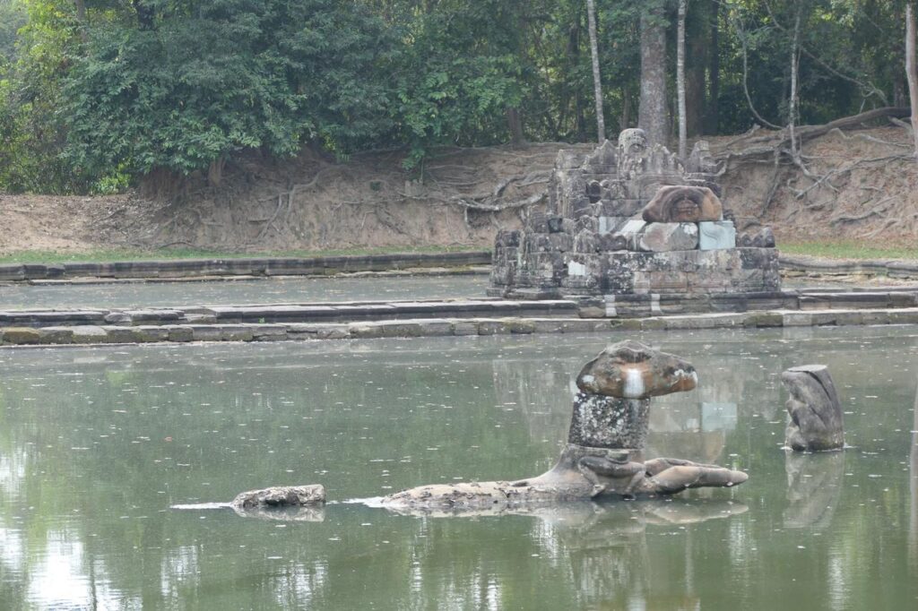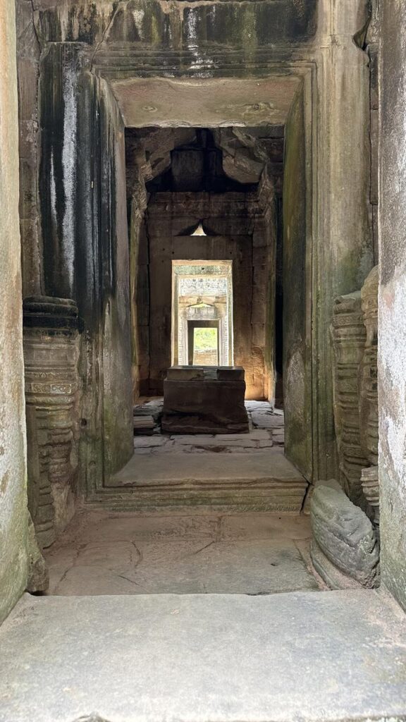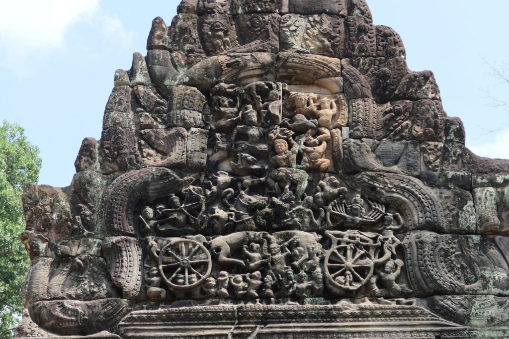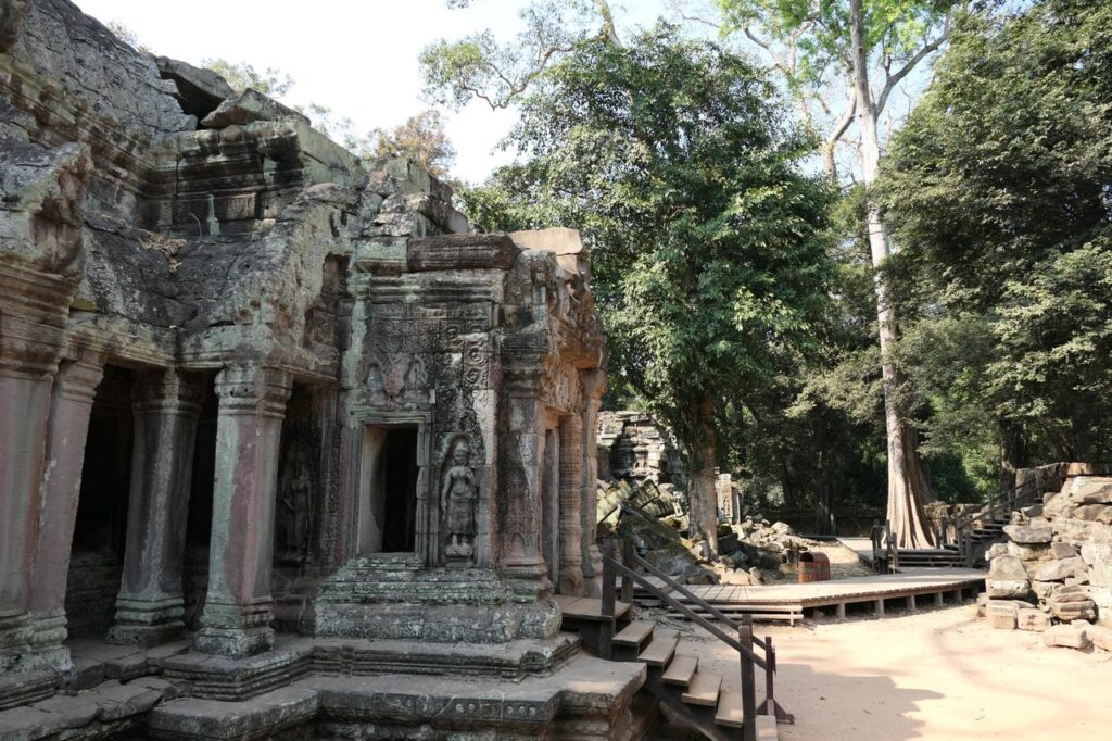 Prea Khan war vor Angkor Thom die Hauptstadt und war dem Sieg über die Cham Invasoren gewidmet. Entlang der gesamten Mauer halten Garuda, Adlerwesen, die Naga-Schlange. Man kann hier auch sehen, wie die Fenster aus dem Stein geschnitzt wurden, da einige nicht fertig geworden sind. Dummerweise hat man hier poröses Lavagestein für den Bau genutzt. Dadurch ist es feuchter und es setzt sich viel Vegetation fest. Der Tempel muss alle zwei Jahre komplett gereinigt werden.