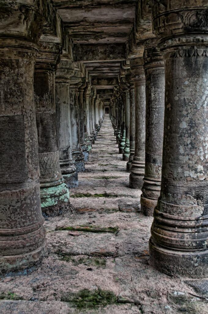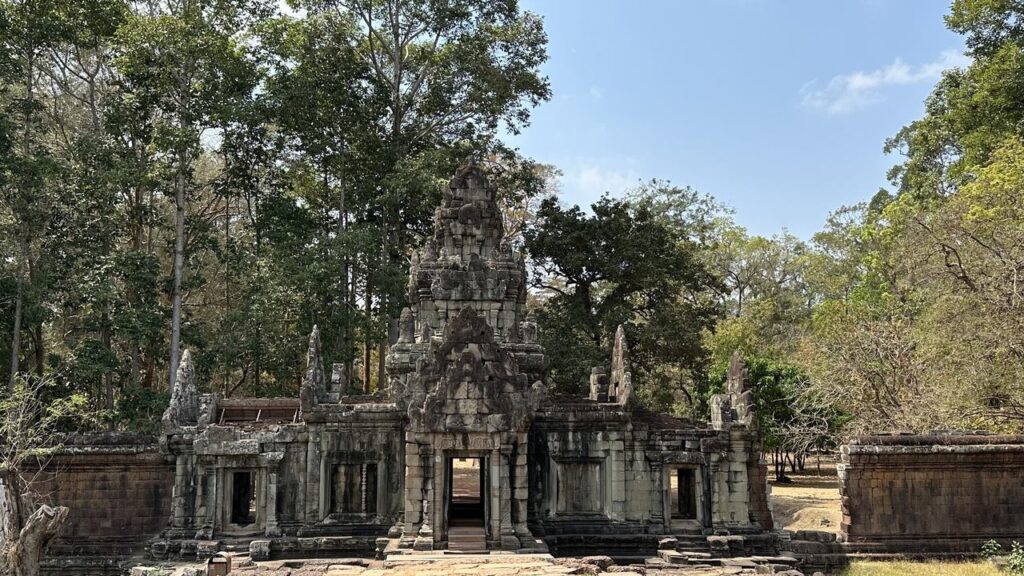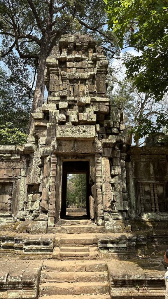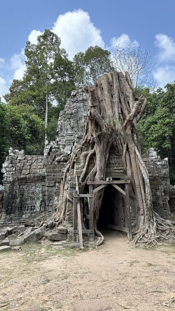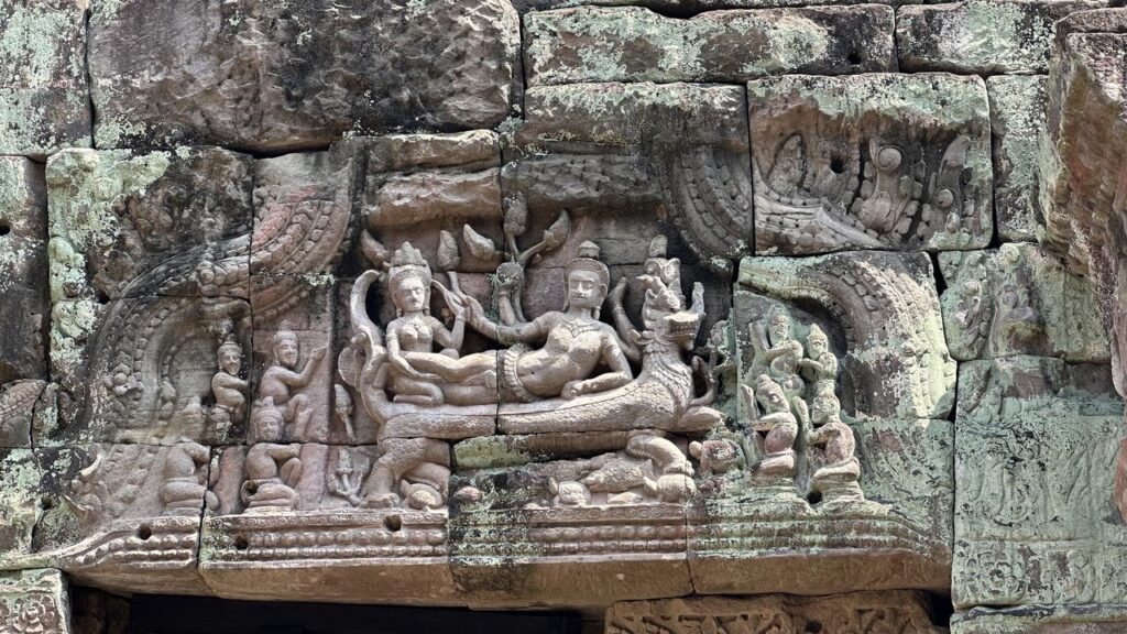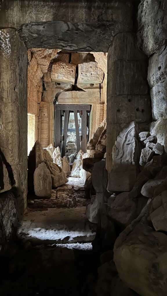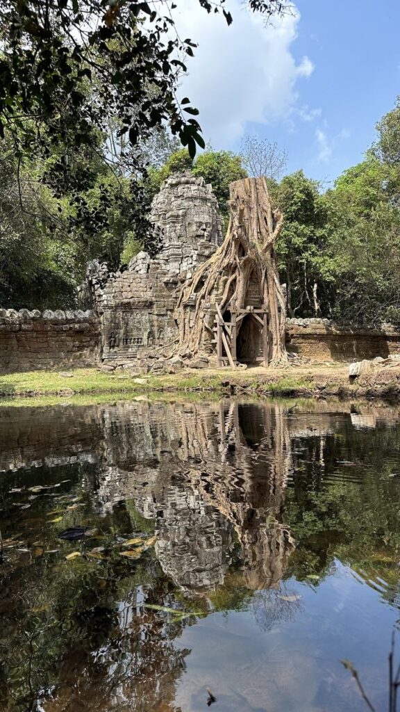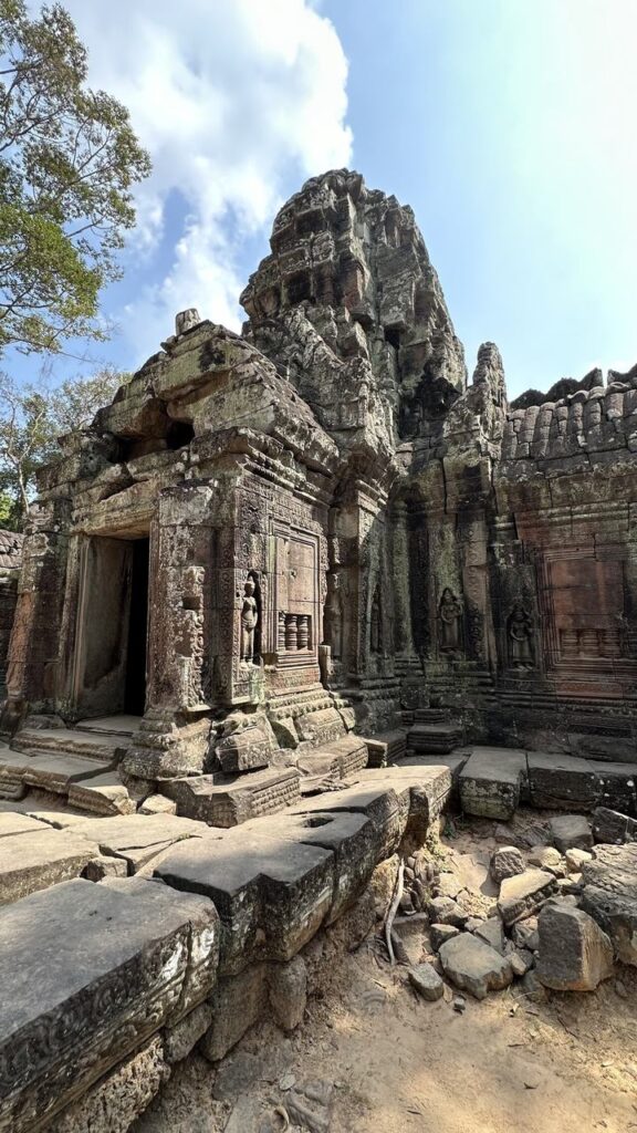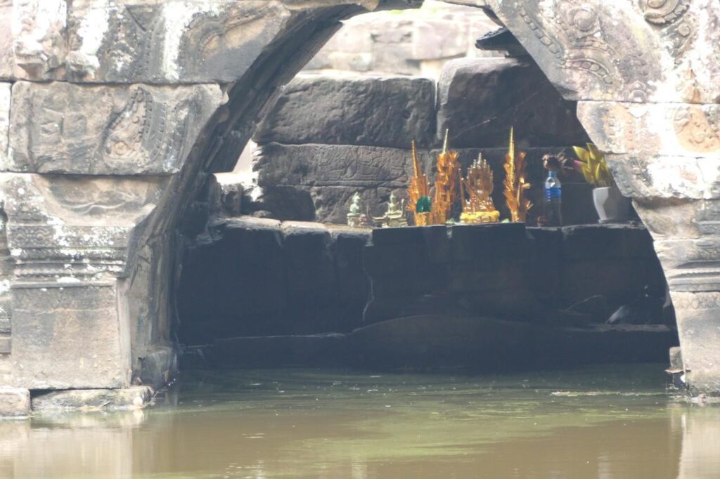 Prea Khan war vor Angkor Thom die Hauptstadt und war dem Sieg über die Cham Invasoren gewidmet. Entlang der gesamten Mauer halten Garuda, Adlerwesen, die Naga-Schlange. Man kann hier auch sehen, wie die Fenster aus dem Stein geschnitzt wurden, da einige nicht fertig geworden sind. Dummerweise hat man hier poröses Lavagestein für den Bau genutzt. Dadurch ist es feuchter und es setzt sich viel Vegetation fest. Der Tempel muss alle zwei Jahre komplett gereinigt werden.