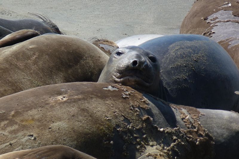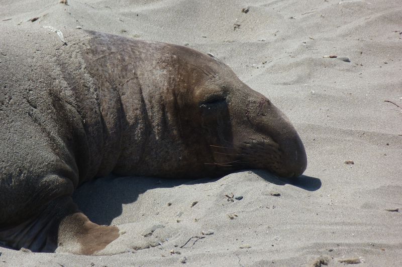 Nachdem wir heute eine Whale Watching-Tour für morgen früh gebucht haben, sind wir die Küsten gen Norden gefahren, da wir von einer See-Elefanten Kolonie gehört haben. Und tatsächlich, an 2 Stränden etwas nördlich von Cambria tummelten sich während ihrer Häutung einige Jungbullen, Kühe und Kälber! Großartig, diese Tiere in ihrer natürlichen umgebung zu erleben und nicht im Zoo!