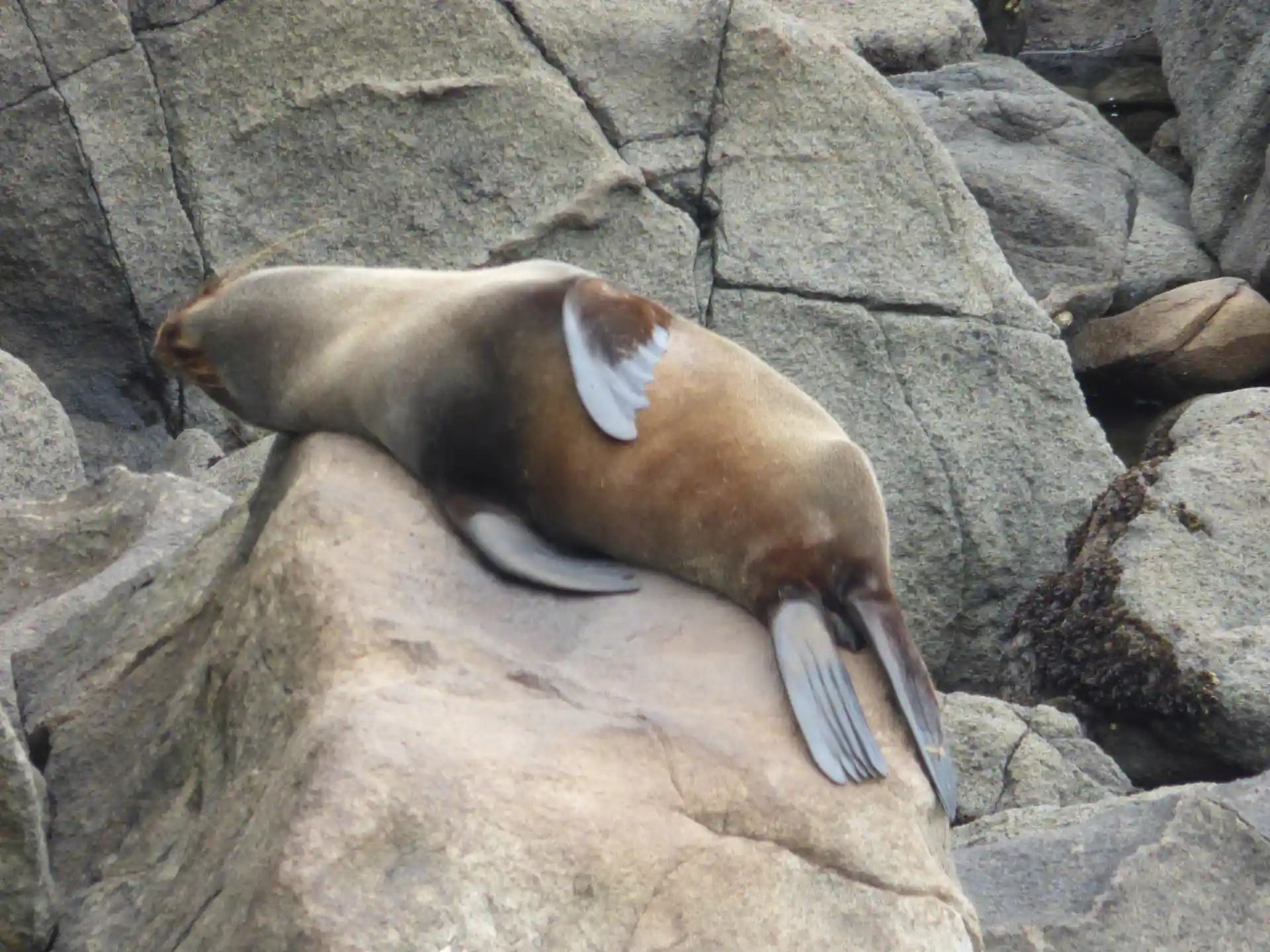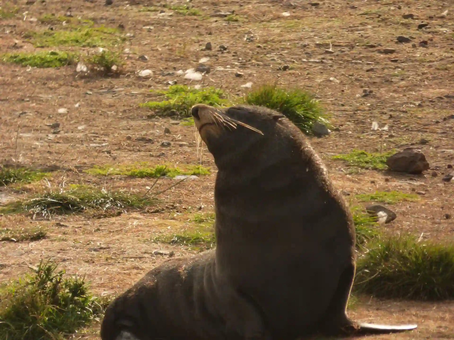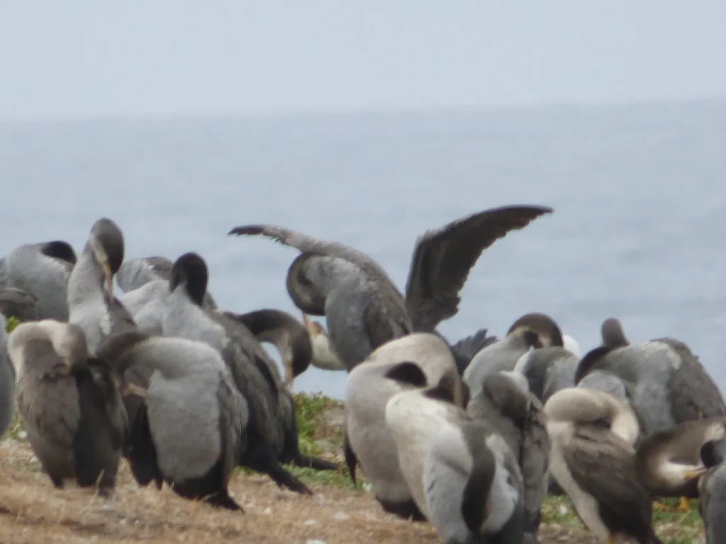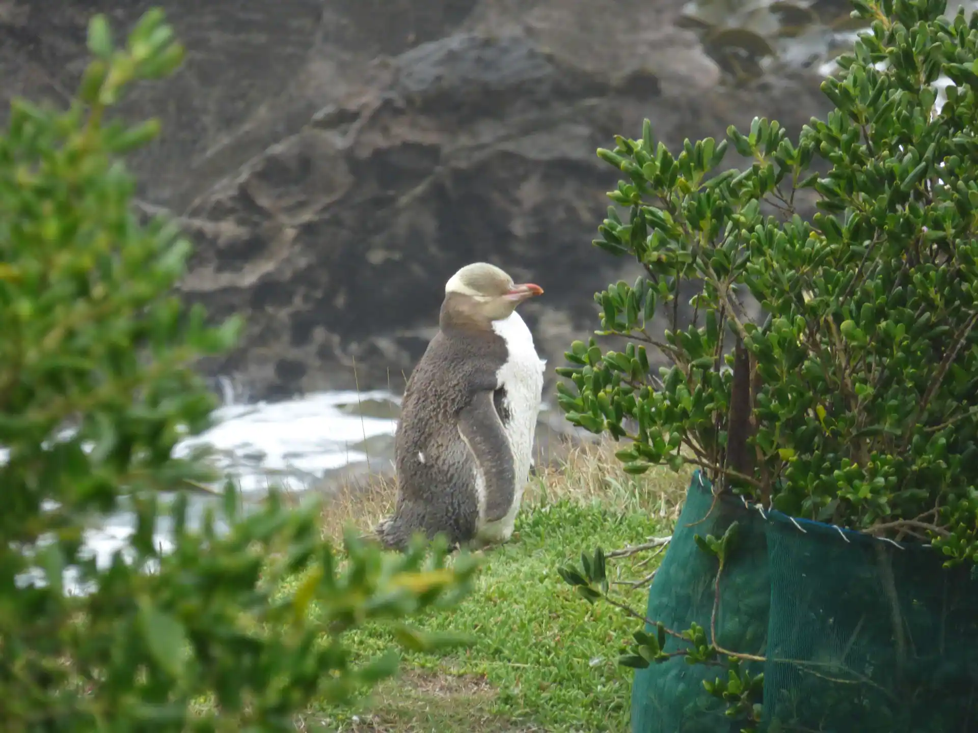 Dummerweise kommen die Pinguine normalerweise nur in der Dämmerung an Land und verbringen die Nacht in ihren Nestern. Einen hat Martina vor die Linse bekommen, aber er war für Handyfotografie zu weit weg.