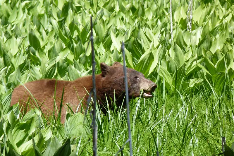 Man hatte uns auch mehrfach vor der „sehr aktiven Bärenpopulation“ gewarnt. Man darf kein Essen (oder Lotion oder andere, duftende Dinge) im Wagen lassen, die Bären drücken einem einfach die Windschutzscheibe ein und reißen die Sitze raus um zu gucken, was da so schön im Kofferraum duftet… Und tatsächlich haben wir an 2 Stellen Schwarzbären einfach so auf den Wiesen sitzen und Gras fressen sehen.