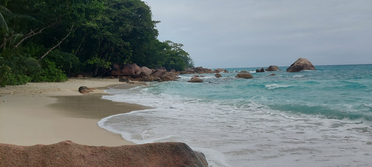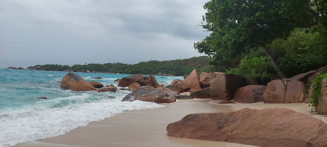 Tags darauf wollten wir den Mietwagen noch ausnutzen und sind trotz nur mäßigem Wetter auf die andere Seite der Insel zur Anse Lazio gefahren. Dieser Strand gehört zu den meist fotografierten der Insel. Das Meer war hier rau, schwimmen ist hier wegen der Strömungen extrem gefährlich. Wir waren trotz der Wolken ganz verliebt in die Wellen, welche sich an den riesigen Granitfelsen dort brachen. Durch eine Lücke in den Felsen gingen wir zum benachbarten Strand, der ebenfalls wunderschön war. Nach einem leckeren Mittagessen (wir essen meistens Fisch, der ist immer und überall super lecker und oft günstiger als andere Gerichte) fuhren wir wieder zurück mit einem Zwischenstopp an der Côte d‘Or, der Goldküste, die ihren Namen auch nicht von ungefähr hat. Und weil ich mich zwischen den zig Fotos nicht entscheiden konnte, bekommt ihr jetzt eben etliche – ich präsentiere: wunderschöner Strand! 😀