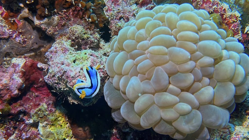 Die Unterwasserwelt hier ist wirklich toll. Da meine GoPro immer wieder unter Wasser trotz 70-90% Akkustand einfriert und nicht mehr an gehen möchte, habe ich mir eine billige Unterwasser-Handyhülle gekauft. Es ist wirklich krass, wie gut die Fotos mit dem iPhone unter Wasser mit einer guten Lampe sind! Leider hat jemand beim „umtopfen“ meines Handy zwischen seiner normalen Hülle und der Unterwasser-Hülle selbiges auf den Boden geschmissen und nun hat mein brandneues iPhone 14 Pro als erstes Handy überhaupt seit ich Handys benutze (also über 20 Jahre) eine Spider-App installiert. Ein neues Display kostet bei Apple auch prompt 400€ 🙁 Mal sehen, ob ich das günstiger hin bekommen kann. Das nächste Mal kaufe ich Apple Care Plus dazu. Ist günstiger. Die Aufnahmen sind trotzdem toll ^^